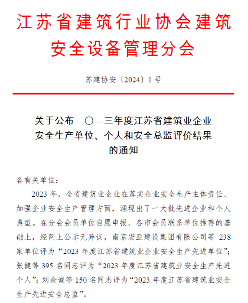 建设集团获评“2023年度江苏省建筑业企业安全生产单位”荣誉