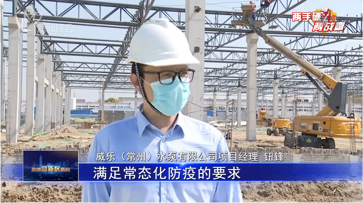 面对常态化的疫情防控,上海分公司常州威乐水泵生产基地项目部不麻痹、不厌战、不松劲,时刻紧绷疫情防控这根弦,牢牢守住安全生产生命线,由于工作突出,项目部还受到了常州市新北区政府的高度赞扬。4月19日,常州市电视台对威乐项目部防疫和生产建设情况进行了报道。