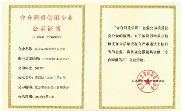 近日,建设集团凭借在合同管理和信用建设方面的卓越表现再次获得“守合同重信用”企业公示证书。